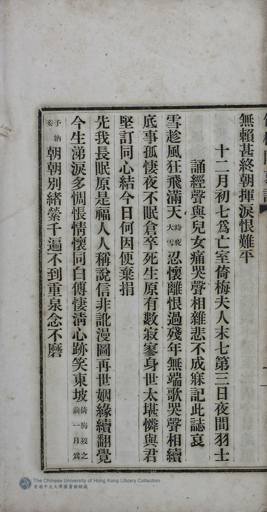 詩詞 [十二月初七爲亡室倚梅夫人末七第三日夜間羽士誦經聲與兒女痛哭聲相雜倍不成寐記此誌哀(二首) ]