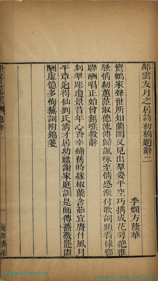 | (PRINT FRIENDLY VERSION) 陽湖張氏四女集(清張曜孫輯) : 鄰雲友月之居詩初稿:四卷 (清張紈英撰)。清道光間(1821-1850)陽湖張氏宛鄰書屋刻本 ![]() 頁碼 : 題辭2.1b | 点 击 放 大 | 陽湖張氏四女集(清張曜孫輯) : 鄰雲友月之居詩初稿:四卷 (清張紈英撰)。清道光間(1821-1850)陽湖張氏宛鄰書屋刻本![]() 頁碼 : 題辭2.1a | 点 击 放 大 | 返回 |