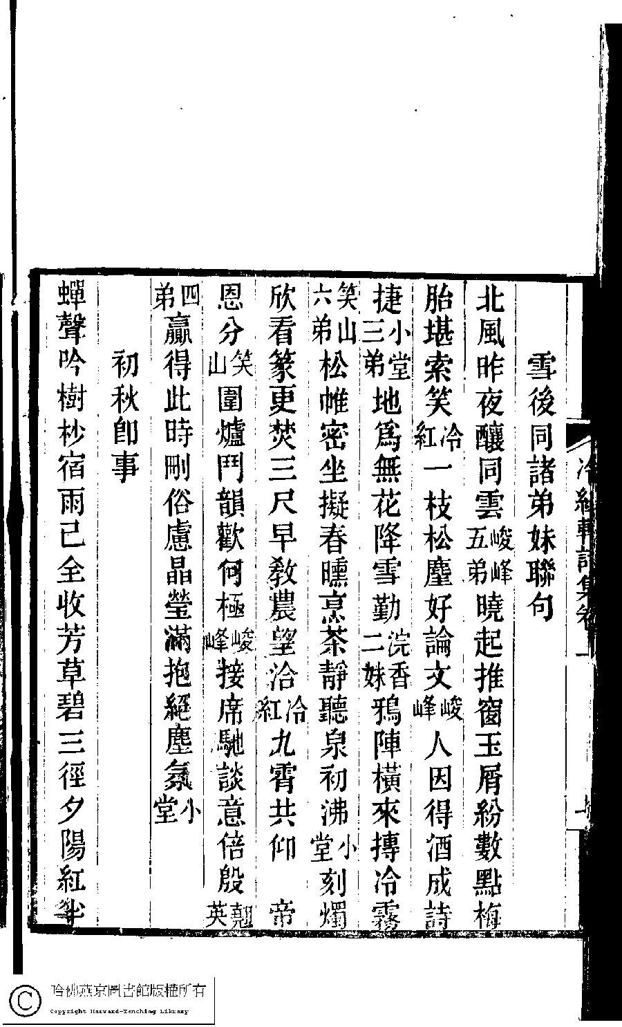| (PRINT FRIENDLY VERSION) 冷紅軒詩集﹕二卷﹐附詞(清百保友蘭撰)。清光緒八年(1882)刻本。 ![]() Page : 上.11a | click for larger image | 冷紅軒詩集﹕二卷﹐附詞(清百保友蘭撰)。清光緒八年(1882)刻本。![]() Page : 上.10b | click for larger image | Back |