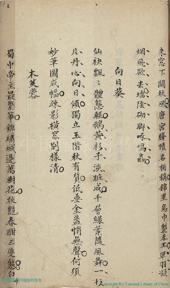 | (PRINT FRIENDLY VERSION) 清芬閣小草:一卷,詩餘:一卷(清鮑蘋香撰)。清光緒間稿本 ![]() Page : 詩.5a | click for larger image | Back |