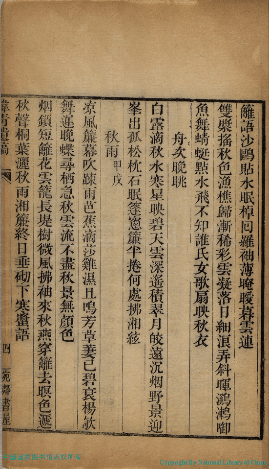| (PRINT FRIENDLY VERSION) 陽湖張氏四女集(清張曜孫輯) : 緯青遺稿:一卷, 附詞 (清張(糸冊)英撰)。清道光間(1821-1850)陽湖張氏宛鄰書屋刻本 ![]() Page : 遺稿.4a | click for larger image | Back |