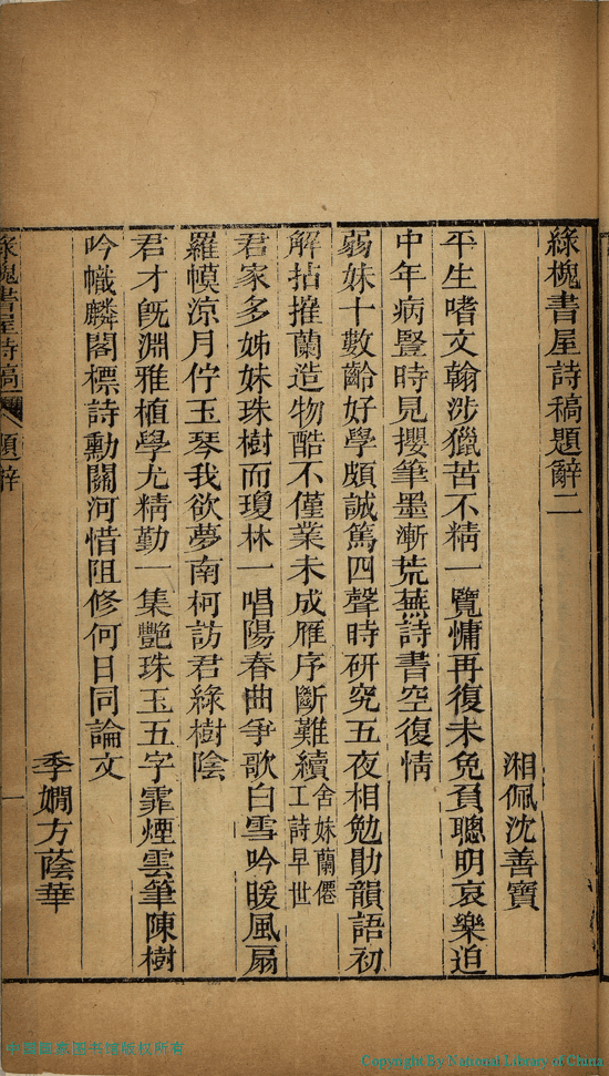 | (PRINT FRIENDLY VERSION) 陽湖張氏四女集(清張曜孫輯) : 綠槐書屋詩初稿:二卷 (清張綸英撰)。清道光間(1821-1850)陽湖張氏宛鄰書屋刻本 ![]() Page : 題辭2.1a | click for larger image | Back |