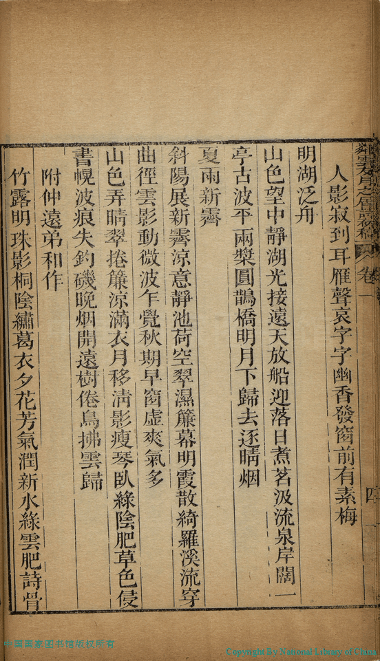 | Appears in: Yanghu Zhang shi si nü ji (edited by Zhang Yuesun, Qing dynasty): Lin yun you yue zhi ju shi chu gao: 4 juan (by Zhang Wanying, Qing dynasty) |