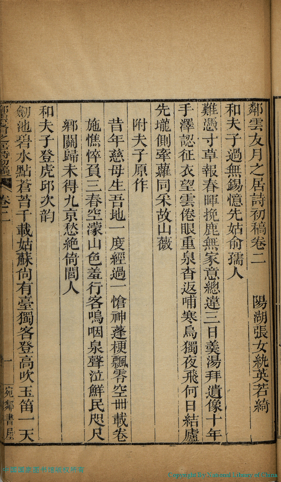 | Appears in: Yanghu Zhang shi si nü ji (edited by Zhang Yuesun, Qing dynasty): Lin yun you yue zhi ju shi chu gao: 4 juan (by Zhang Wanying, Qing dynasty) |