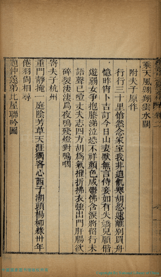 | (PRINT FRIENDLY VERSION) 陽湖張氏四女集(清張曜孫輯) : 鄰雲友月之居詩初稿:四卷 (清張紈英撰)。清道光間(1821-1850)陽湖張氏宛鄰書屋刻本 ![]() Page : 2.7b | click for larger image | Back |