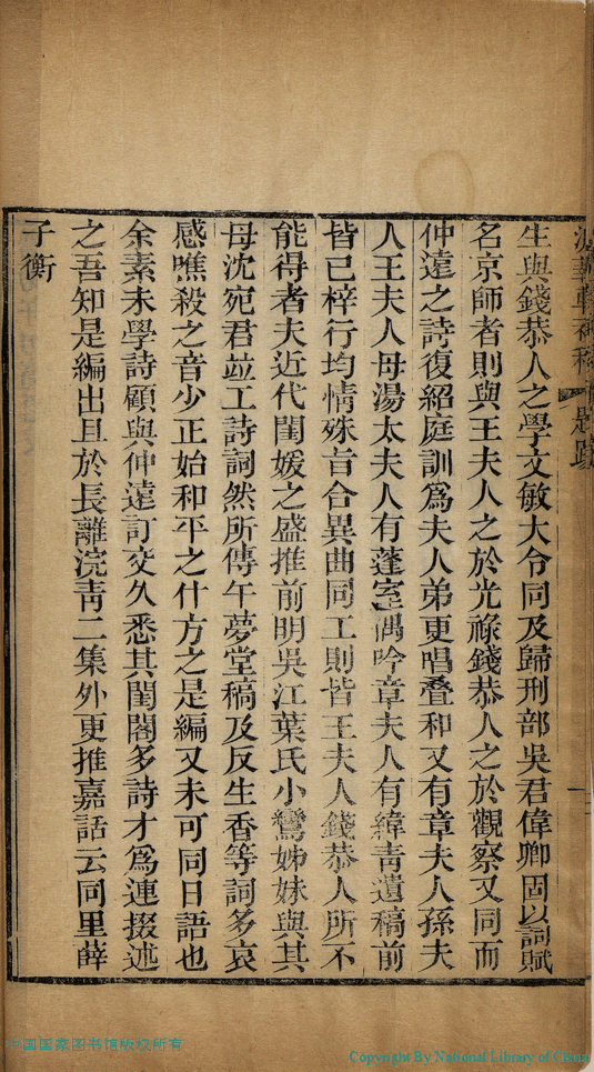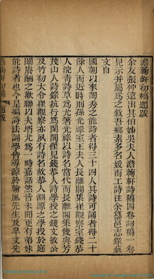 | (PRINT FRIENDLY VERSION) 陽湖張氏四女集(清張曜孫輯) : 澹蘜軒詩初稿:四卷, 詞:一卷 (清張䌌英撰)。清道光間(1821-1850)陽湖張氏宛鄰書屋刻本 ![]() Page : 題跋.1b | click for larger image | 陽湖張氏四女集(清張曜孫輯) : 澹蘜軒詩初稿:四卷, 詞:一卷 (清張䌌英撰)。清道光間(1821-1850)陽湖張氏宛鄰書屋刻本![]() Page : 題跋.1a | click for larger image | Back |