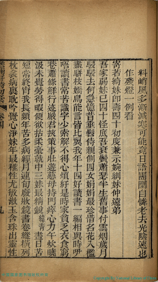 | (PRINT FRIENDLY VERSION) 陽湖張氏四女集(清張曜孫輯) : 澹蘜軒詩初稿:四卷, 詞:一卷 (清張䌌英撰)。清道光間(1821-1850)陽湖張氏宛鄰書屋刻本 ![]() Page : 4.9a | click for larger image | 陽湖張氏四女集(清張曜孫輯) : 澹蘜軒詩初稿:四卷, 詞:一卷 (清張䌌英撰)。清道光間(1821-1850)陽湖張氏宛鄰書屋刻本![]() Page : 4.8b | click for larger image | Back |