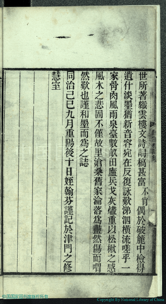| (PRINT FRIENDLY VERSION) 織雲樓集:五卷(清陳貞撰)。光緒六年(1880) ![]() : 序.1b | 織雲樓集:五卷(清陳貞撰)。光緒六年(1880)![]() : 序.1a |