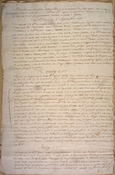 Mounier, Henry. Journal ... pour le Voyage ... de Québec ... aux Iles Antilles, 1778-1779. An electronic transcription. MFTP #0002 2. 5hres qu'il nous a calmé tout plat par le travers du petit metis & à continué ainsi jusqu'à minuit – à deux hres aprés midy nous avons vu un Nre du coté du Nord qui paroissoit vouloir monter à Quebec[.] du Mardy 1 Septembre 1778 De minuit à 9hres ce matin calme tout plat, beautemps, au jour nous avons trouvé que les Courrants nous avoient baissé jusques par le travers de Matannes, à 8hres nous avons vu un batiment au Nord de nous qui nous à paru être Senault et faire route pour Quebec, à 9hres nous en avons vu un autre qui nous à paru à 3 mats & faire même route, pour lors le vent à affraichi au N & NNE porté au plus prés, à dix hres nous avons vu deux voiles devans nous, mais nous n'avons pas eu le temps de les distinguer, ni connoitre la route qu'ils tenoient à cause de la pluye qui à commancé pour lors à tomber avec abondançe, le temps couvert par tout; à 1hre après midy le vens à sauté à Ouest, petit fraix, la pluye à continué jusqu'à 2 hres pour lors elle à cessé le vens ayans augmenté en varians à OSO, il à eclairci le temps, mais nous n'avons pu decouvrir les deux batiments dons est parlé cy dessus, à 5hres ½ nous etions par le travers du Cap Chat, continué avec bon vent & beautemps jusqu'à minuit[.] Mecredy 2 dt Depuis minuit jusqu'à deux hres aprés midy nous avons eu bon vent, varians du OSO, & O, ONO & Nord, joly frais, à la pointe du jour nous etions une lieue plus bas que les Monts Louis, à 9 hres ¾ par le travers de la R.re aux Renards, vu une petite goelette qui serroit la terre faisans même route que no[us] à midy nous etions par le travers de la vieille, vu pour lors une fregate au Large, sur les dttes. 2 hres le vent est tombé tout plat etans par le travers de la pointe St Pierre, vu 3 goelettes mouillées le long de cette côte & un bricq endeda[ns] de la pointe St Pierre, un moment aprés le vent à pris à l'Est, petitte brise[.] [L]a fregate à porté sur nous & à 3 hres ¾ elle nous à tiré un coup de Canon. Pour quoy nous avons mis en travers, à 4 hres elle etoit à portée de la voix, elle nous à demandé d'ou nous venions, ou nous allions s'il y avoit quelque chose d[e] nouveau à Quebec, ou des Corsaires en riviére, à quoy ayans Satisfait, elle nous à dis qu'il n'y avois poins de Corsaires aux environs de la Baye & que le bricq que nous voyions etoit au Roy en Croisiére dans ces parages, aprés sur les 4 hres fait Servie, mais le vens ayans moly & les Courrants nous drossans dans la mal baye nous avons arrivé pour passer entre L'Isle Bonnaventure & L'Isle percée, à 5 hres calme tout plat jusqu'à 7 que le vent à pris joly fraix du coté du Ouest porté au plus prés les amures sur Tribord & à 8 hres nous avons paré L'Isle bonnaven[ture] à l'honneur; une chalouppe est venue à bord qui à pris la Lettre de Mr Pre Fargues à P. Frazes, continué ainsi jusqu'à minuit, temps clair pendans les 24 hres[.] Jeudy 3 dt Pendans ces 24 hres nous avons couru plusieurs bordées avec les vents variant du NNO, au NO, le temps beau, la mer agitée, à la premiére bordée que nous avon[s] été virer sous la terre entre Caraquet et la grande passe de Miscou nous avons donné deux coups de Talon sur une bature qui court extrémemens au Large & plus au large que nous ne pensions, cela cependans ne nous à poins empeché de virer de bord le batimens n'ayans nullement arrété, à 9 hres du matin [4] L E G E N D : |