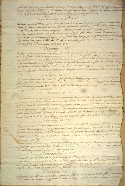 Mounier, Henry. Journal ... pour le Voyage ... de Québec ... aux Iles Antilles, 1778-1779. An electronic transcription. MFTP #0002 5 qu'il s'est eclairci pris hauteur à midi et trouvé être par la Lat. N 43.30 & de long. 61.10 route corrigée le SSE, 3d E. chemin corrigé depuis mon depart 80 Lieues variatio[n] NO. 15d fait hisser le petit hunnier aprés avoir largué les riz[.] du Mardy 10 9(bre) 1778 Pendans ces 24 hres les vents ont régné du NNO au SO passans par le Ouest bon fraix, le temps couvert; la mer grosse, quoi qu'elle ait bien tombé, fait porter au S & SSE sous les 4 voiles majeures hautes jusques à 11 hres de nuit que s'etans levé un grain de Ouest trés gros fraix avec pluye fait serrer toutes les voiles et resté avec la mizenne jusques à aujourd'huy midy, que n'ayans poins eu d'hauteur j'ai trouvé être par la Lat. Est N 42.4 & de Long. 60.13. La route m'à valu le SSE & fait 32 L. variation NO 14d15m[.] Mecredy 11 dt [D]e hier midy à aujourd'huy midy les vents ont regné de la partie du NO variant au NNO, gros fraix, le temps par grains, la mer trés grosse fait porter au S jusques sur les 10 hres du Soir, rien qu'avec la mizenne, pour lors le vent ayans un peu moly & la mer tombée mis la grand voille et le petit hunier, ses ris pris et la voille d'Etage j'ai observé à midy 40.18 de L N et de long. 60.20 le chemin corrigé depuis ma derniére hauteur 65 L & la route aussi corrigée S¼SE, estimans 12d de variation NO. Jeudy 12 dt Les vents variables du N au NO. gros fraix, le temps par grains, la mer trés agitée fait porter au S¼SE. avec toutes voiles si non les bonnetes, à midy j'ai eu hauteur me suis trouvé par 33.17 de Lat N & 60d 4m de Long. route corrigé S¼SE chemin corrigé 41 L 1/3 ¼ de variation[.] Vendredy 13 dt Depuis hier à aujourd'huy les vents ont été bien variables depuis le NNO au SSE, passans par le Ouest, des grains de pluye toute la nuit, fait porter au S¼SE jusqu'[à] 4 hres ce matin fait serrer toutes les petites voiles jusqu'à 10 hres qu'il est venu un grain qui nous à obligé de mettre à Sec pendans une demy hre & ensuite calme, fait servir suiv.t le vent[.] [L]e vent à été aussi variable que le temps à midy eu hauteur trouvé 37.11 de L.N. & de Long. 59.28 route corrigée SSE & chemin corrigé 23 L. Samedy 14 dt Pendans ces 24 hres les vents ont regné du O au ONO, moyenne Brize le temps couvert la mer agitée fait porter au S avec la mizenne, la grande voille & le peti[t] hunnier toute la nuit, à 8 hres ce matin mis le grand hunnier, les perroquets et les Royalles, à midy observé 36d de Lat N. & 59.12 de Long. route corrigée S¼SE ch. corrigé 23 L 2/3. Nous nous sommes appercus aujourd'huy que l'eau avoit beaucoup augmenté [à] la pompe qui nous à obligé de Pomper de demy heure en demy heure sans pouvoir decouvrir d'ou pouvoit provenir cette voye d'Eau. Dimanche 15 dt Les vents ons été variables pendans ces 24 hres du NNO au SO, passans par le O petitte brize jusqu'à 10 hres du Soir qu'il à soufflé bon fraix de SO le temps clair la mer agitée, porté les 4 voiles majeures jusqu'à midy que j'ay obsevé 34.55 de Lat N & 58.41 de L. Route corrigée SSE & fait 22 Lieues de chemin. Lundy 16 dt Pendans ces 24 hre, les vents ons regné au SO & SSO, grosse brize, fait porter au SSE sous les 4 voiles majeures, voiles d'Etage, & tourmetin, à midy n'ayans [7] L E G E N D : |