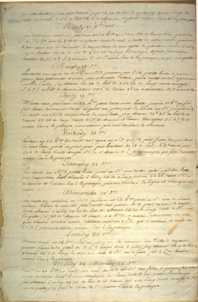 Mounier, Henry. Journal ... pour le Voyage ... de Québec ... aux Iles Antilles, 1778-1779. An electronic transcription. MFTP #0002 6. pu avoir hauteur je me suis trouvé par 34.34 de Lat. N & par 57.40 de Long. la route m'a valu le SE. & fait 24 L de chemin, toujours même Eau à la pompe[.] Mardy 17 9(bre) 1778 Les vents ons continué pendans ces 24 hres du SO au ONO bonne brize porté au S & S¼SO, avec les 4 voiles majeures toute la nuit, & toutes les autres voiles pendant le jour ainsi que les bonnetes, le temps clair, la mer agitée de plusieurs vents, à midy j'ay eu hauteur 33.15 de Lat N. & 57.35 de Long. Rte corrigée depuis la derniére hauteur le SE. 3d S & chemin C 27 L, même Eau à la pompe, ce qui m'inquiète[.] Mecredy 18 dt Les vents ons régné du NNE au SSO passans par l'Est petitte brise à peine pour faire gouverner & même par intervalle Calme, porté toutes voiles, & gouverné au Sud, à midy j'ay observé 32.30 de Lat. N. & 57.23 de Long. route corrigée S 5d E. & fait de chemin dessus 28 L ¼ Estimé 1d 30. de variation NO, même Eau[.] Jeudy 19 dt Même vens pendans ces 24 hres porté toutes voiles hautes jusqu'à 10 hres que j'ai fait serrer les menues voiles et porté au plus prés la bordée du SE jusqu'à midy les vents au SSO, temps clair la mer belle, j'ay observé 31d 46 de Lat. N & trouvé 57.23 de long. Route le S. & chemin 15 Lieues variation 3 à 4d NO même Eau à la pompe, nous avons pris une Dorade à la fouane[.] Vendredy 20 dt Pendans ces 24 hres les vents ont regné au SO & SSO, petit fraix, temps clair la mer belle, porté au plus prés pris hauteur 31.18 de Lat. N. & trouvé par 57.8 de Long. Route corrigée SE¼S. chemin 10 L je ne compte que peu de variatio[n] même Eau à la pompe[.] Samedy 21 dt Les vents au SSO petitte brise porté au SE avec toutes voiles possible, belle mer, temps clair, Latit. observée à midy 30.31 & Long. arrivée 56.56. route SE¼S & chemin 10 L même Eau à la pompe, pris une Dorade à la ligne et manqué une autre[.] Dimanche 22 dt Les vents ons continué au SSO, pendans ces 24 hres porté au SE avec la même voilure d'hier, la mer s'est faite sentir trés grosse de la part du nord O, temps clair, observé à midy 30.27 de Lat. N. & trouvé 56.20 de Long. route le SE, sur laquelle j'ai fait de chemin 18 Lieues, à 5 hres ½ ce matin nous avons vu un gros navire derriére nous distance environ 1 L ½ qui à continué sa route au l'ENE, & nous la nôtre, même Eau à la pompe[.] Lundy 23 dt Même vens ces 24 hres porté au plus prés les amures sur Tribord, toujours grosse Lame de la part du NO, le temps clair, à midy j'ay observé 30.9 de Lat. N & trouvé 56.2 de Long. la route m'a valu le SE. sur la quelle fait 8 L de chemin même Eau à la pompe[.] Mardy 24 & Mecredy 25 dt Pendt ces 48 hres les vens ont varié du SSO, au SE. trés faibles et quelques fois calme couru la bordée suivt le vens toujours la Lame du NO. trés grosse, beautemps. [J]'ai observé à midy 29 30 de Lat N et trouvé 56o de Long. route corrigé le SSE sur la quelle j'ay fait de chem. 14 L – même Eau à la pompe[.] [8] L E G E N D : |