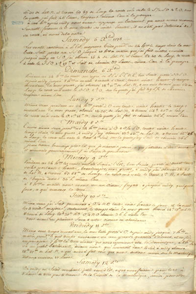 Mounier, Henry. Journal ... pour le Voyage ... de Québec ... aux Iles Antilles, 1778-1779. An electronic transcription. MFTP #0002 8. 16.31 de Lat. N. et trouvé 60 59 de Long. la route m'a valu le S¼SO 4d O, sur la quelle j'ai fait 46 lieues, toujours même Eau à la pompe[.] [À] une hre aprés midy nous avons apperçu un batiment , que nous avons reconnu Senault, faisans le O. avec toutes ses voiles hautes, il ne s'est pas detourné de sa route, ni nous de la nôtre[.] Samedy 5 X(bre) 1778. Les vents continué à l'Est, moyenne brize pendt ces 24 hres le temps clair la mer belle, fait porter au SSO, jusqu'à 10 hres ce matin, que j'ai fait mettre ensuite jusqu'à midy au SO, j'ai observé 15.4 de Lat. N. et trouvé 61.40 de Long, la route à valu le SSO 1d 15m et fait de chemin 37 Lieues, même Eau à la pompe[.] Dimanche 6 X(bre) Pendans ces 24 hres les vents ons regné de l'E à l'ENE, bon fraix, porté a OSO – depuis midy jusqu'à 8 hres ce matin & ensuite à Ouest, toutes voiles hautes, le temps inconstans, la mer grosse, j'ai observé 14d 11m de Lat. N, & me suis trouvé par 63 de Long. la route m'à valu le OSO, 2d O, sur laquelle j'ai fait 49 L ½ de chemin toujours même Eau[.] Lundy 7 dt Même vens pendans ces 24 hres porté à O, avec toutes voiles hautes le temps inconstans la mer grosse, observé 14.26 de Lat. N, 64d 50m de Long – la route m'a valu le O, 1d 15m N. sur laquelle j'ai fait de chemin 36 L, même Eau[.] Mardy 8 dt Encore même vens pendt ces 24 hres porté à O & O¼SO, toutes voiles hautes temps clair, la mer grosse, à midy j'ay observé 13d 53m de Lat. N, & trouvé 66d 25m de Long. la route m'a valu le Ouest 4d Sud sur laquelle j'ay fait de chemin 36 L même Eau[.] [J]e me trouve beaucoup plus Est que je n'aurois pensé, ce que j'attribue à des Courrants et mauvais gouvernement / ou façon de gouverner[.] Mecredy 9 dt Pendans ces 24 hres les vents ont été fixés à l'Est, bon fraix, porté à Ouest toutes voiles portantes hautes, beautemps, mer grosse, à midy j'ai observé 13.57 de Lat N, & trouvé 67.58m de Long, la route m'a valu le Ouest 1d N, & fait de chemin dessus 36 L. même Eau[.] [À] 8 hres ce matin nous avons vu un oiseau / fregate, & jusqu'à midy, quelques foux, ce qui annonçe la terre[.] Jeudy 10 dt Même vens j'ai fait gouverner à O¼NO, toutes voiles hautes le jour et la nuit les 4 voiles majores seulement, le temps clair, la mer grosse observé 14d 17m de L N. & trouvé de Long. 60d 20m Rte O¼NO, chemin 36 L. même Eau[.] [N]ous avons vu plusieurs foux & autres oiseaux en abondance[.] Vendredy 11 dt Même vens temps inconstans, la mer belle porté à O. depuis midy jusqu'à 7 hres ce matin, pendt le quel temps nous avons vu une grande quantité d'oiseaux, et enfin un peu aprés 7 hres la terre même que nous esperions être la Dominique, à 8 hres ½ vu un petit batiment, devans nous qui courroit dans le Sud, à midy observé 14d 27m de Lat. N, ce qui nous à fait voir que nous devions courir sur la Martinique distance environ 10 Lieues[.] Samedy 12 dt De midy au Soleil couchant petit vens d'Est, nous nous faisions pour lors à 5 Lieues de terre par le travers de la Trinité de la Martinique; arrivé pour aller [10] L E G E N D : |