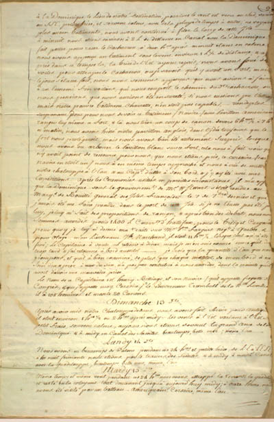 Mounier, Henry. Journal ... pour le Voyage ... de Québec ... aux Iles Antilles, 1778-1779. An electronic transcription. MFTP #0002 9. à la Dominique le Lieu de nôtre Destination, pour lors le vent est venu au Sud, varian[s] au SSE, petitte brise, et souvens calme, avec de la pluye de temps à autre; ne voyan[s] plus aucun batiments, nous avons continué à filer le long de cette Isle[.] [À] minuit nous etions environ à 2 L. de distance en Canal avec la Dominique fait porter pour raser le Cachacrou, à deux hres aprés minuit etans en calme nous avons apperçu un batiment sous le vens environ 1 L ½ de distançe, & a[…] prés dans ce temps la, la brise de l'Est ayans repris, nous avons forcé de[…] voiles pour attraper le Cachacrou, ou je savois qu'il y avoit un Fort, mais le jour s'etans fait, nous nous sommes apperçus que nous avions à faire à un Ennemi fin voiliers, qui nous coupoit le chemin du dt cachacrou, ou nous pensions que nous aurions été en sureté, si nous eussions pu l'attrap[er] mais nôtre pauvre bâtimens Charrette, n'en etoit pas capable. [R]ien de plus surprenans donc pour nous de voir ce batimens / Navire / avec Pavillon americain ranger luy même ce fort, & là nous tirer un coup de canon devers 6 hres ½ à 7 h[res] ce matin, nous avons hissé notre pavillon anglois, dans l'jdée toujours que le fort nous protégeroit, mais nous avons bien été autrement Surpris lorsque nous avons vu arborrer le Pavillon blanc sur ce fort, cela nous à fait voir qu['il] n'y avoit point de ressourçe, pour nous, que nous étions pris, ce corsaire / car navire en etoit un / nous à en même temps approché et nous à crié de mettre nôtre chalouppe à l'Eau & au Capt d'aller à son bord, & j'y ay été avec mes Expéditions[.] Aprés les Ceremonies usitées en pareilles circonstances, jl m'a app[ris] que la Dominique sous le gouvernemt de Mr W Stuart s'etoit rendue au Marqus de Bouillé General des Isles françoises le 7 de 7(bre) dernier et que j'aurois été me faire prendre dans le port de cette Isle si je ne l'eusse pas été p[ar] luy, je luy ai fait des propositions de rançon, & aprés bien des Debats, nous nou[s] Sommes accordés pour 1400 £ Courrt d'Hallifax, pour le bricq et Cargaiso[n] pour quoy je luy ai donné ma Traite sur Mr Pre Fargues Negt à Quebec, & pour otage, mon Lieutenans Jh Marchand, jl etoit 11 hres ½ lorsque tout ceçi à été fini; Le Capitaine à voulu me retenir à diner, mais je m'en suis excusé sur ce qu'il d[…] trop tard & j'ai retourné à bord aussitot – je crois que la quantité d'Eau que nou[s] pompons, et qu'il à bien examiné, de plus que chaque matelot de mon bord à eu Soin d'exagérer à ceux du sien, n'à pas peu contribué à nous accorder, dans la crainte qu'il avoit d'avoir une mauvaise prise[.] Le Nom de ce Capitaine est Henry Billings, et son Navire / qu'il appelle fregatte d[e] Congrés, & que j'appelle moy, Corsaire / Le Gouverneur Trumbull de la Nlle Londre[s] il à 108 hommes et monte 20 Canons[.] Dimanche 13 dt Aprés avoir mis nôtre Chalouppe dedans, nous avons fait Servir pour Antig[ue] il etoit environ 1 hre ½ ou 2 hres aprés midy. Les vents à l'Est varians à l'Est […] petit frais, souvens calme, aujour nous etions devant la grand'Ance de la Dominique & à midy en Canal des Saintes beautemps, belle mer; même Eau[.] Lundy 14 dt Nous avons eu beaucoup de Calme pendans ces 24 hres et petitte brise, de L'E à L'ESE à la nuit fermante nous etions par le travers des Saintes & à midy à moitié Canal avec la Guadelouppe, beautemps, belle mer, même Eau[.] Mardy 15 dt Même temps et même vent pendans ces 24 hres nous avons attrappé la Terre de la Guadel[ouppe] et resté en la cotoyans tout doucement jusqu'à aujourd'huy midy; à onze heure nou[s] avons été visité par un batteau ameriquain, Corsaire, même Eau[.] [11] L E G E N D : |