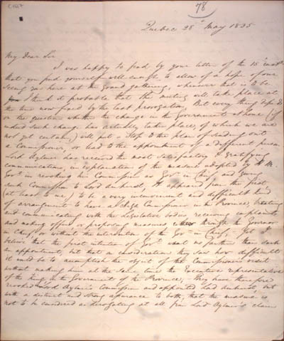 Cochran, Andrew William. Eight letters to Roderick Mackenzie, 1823-1837. An electronic transcription. MFTP #0004 Quebec 28h May 1835 My Dear Sir I was happy to find by your letter of the 15h instt that you find yourself well enough to allow of a hope of our seeing you here at the grand gathering, wherever that is to be. I think it probable that the meeting will take place at the time now fixed by the last prorogation[.] But every thing depends on the question whether the change in the Government at home (if indeed such change has actually taken place, of which we are not yet certain,) will put a stop to the plan of sending out a Commissioner, or lead to the appointment of a different person. Lord Aylmer has received the most satisfactory & gratifying communications, in explanation of the measure adopted by H. M. Govt in revoking his Commission as Govr in Chief, and giving such Commission to Lord Amherst[.] It appeared from the first, (at least to me,) to be a very inconvenient and difficult kind of arrangement to have a High Commissioner in the Province, treating and communicating with the Legislative bodies, receiving complaints and making offers, or proposing measures, either through the Governor in Chief, or without the intervention of the Govr in Chief[.] Yet I believe that the first intention of Govt went no farther than such an appointment; but that on consideration they saw how difficult it would be to accomplish the object of the Commissioner's visit without making him at the same time the Executive representative of the King, in the Government of the Province[.] They have therefore revoked Lord Aylmer's Commission and appointed Lord Amherst, but with a distinct and strong assurance to both, that the measure is not to be considered as derogating at all from Lord Aylmer's claim [1] L E G E N D : |