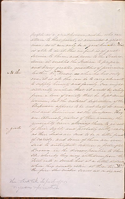 MacDonell, John. Description of Lake Athabasca and the Chipweans, ca. 1805 and Journal of a Voyage from Lachine to Fort River Qu'Appelle, 1793. An electronic transcription. MFTP #0005 people as a great honour, and he, who can attain to that point, is accounted a great man; as it can only be a good hunter that is able to do it. This in fact is of great service to them, and even to the Traders; since it enables the Indian to prepare and bring greater quantities of provisions, leather &c. Houses: as when he has only one, it is all she can do to carry wherewith to supply himself and family. One might naturally conclude that it would be solely from a love of variety that he kept several women; but the natural disposition of the Chipwean appears to be not half so amorous and lascivious as the European. They are extremely jealous of their women; the generality never allowing them to go out of their sight; and probably with reason, as their Ladies are said to be a little fond of variety; and some of them are even said to anticipate nature a fortnight d'avance in the diseases peculiar to their sex; whereby they may withdraw from the Tent into a small hut at a little distance where they usually retire at those times;– the fire she makes serves as a signal [20] L E G E N D : |