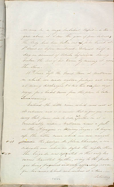 MacDonell, John. Description of Lake Athabasca and the Chipweans, ca. 1805 and Journal of a Voyage from Lachine to Fort River Qu'Appelle, 1793. An electronic transcription. MFTP #0005 we came to, a rough turbulent Rapid[.] [A] League above it I saw the grave of poor lalondes; the Body had been taken out of to be buried at St Anns as before mentioned[.] Detained half a day on account of Titiche LafrĂȘnieres having broken the bow of his Canoe by running it against the Shore. 15th June[.] Left the Grand River at Mattawin in which we made eighteen portages and about as many dicharges[.] It is said there was four days voyage for a loaded canoe from this place to lake Temiscaming. Entered the little river which runs east at its entrance and is so narrow that a good gun would carry Shot from side to side, further on it is considerably wider[.] Mattawin means a fork in the Algonquin or Nipising Tongue[.] A league up the little river which we now navigate made the portage du Plain Champs, a considerable one where we passed the night. Here the brigade was seperated so that only two canoes travelled together, owing to the portages being frequent and only affoarding room for two canoes to load and unload at a time. Saturday [61] L E G E N D : |
