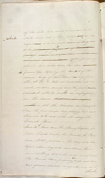 MacDonell, John. Description of Lake Athabasca and the Chipweans, ca. 1805 and Journal of a Voyage from Lachine to Fort River Qu'Appelle, 1793. An electronic transcription. MFTP #0005 of the Lake by a variety of channels to the North North West of the portage and are too rapidious to be navigable above if they are to be judged of by nearest of them to the portage which is steeper than a mill race and not wider in places[.] After proceeding about two miles down the cove we carried from Lac Nipising the currant of the main body of the F River comming from the N.N.E. took us broad side and carried us down merrily being the first current able to make an impression on the canoe that we have drifted with[.] At the Chaudiere des Français I saw the first Juniper berry growing but now they are to be met with all along the French River. June 26th[.] Came down the following Rapids, Les Pins, Rapide Croche, La Fausille, Le Parisien, Petit parisien[.] The day is a beautiful clear day and sun shine. Have seen nothing but rocks since we entered the French River producing moss and some ever-greens stinted in growth, one would think [66] L E G E N D : |