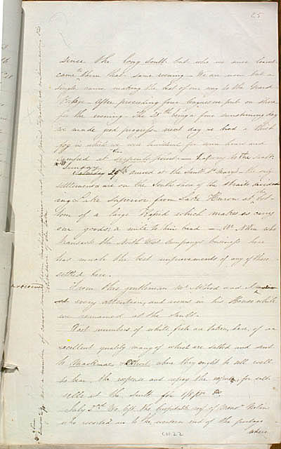 MacDonell, John. Description of Lake Athabasca and the Chipweans, ca. 1805 and Journal of a Voyage from Lachine to Fort River Qu'Appelle, 1793. An electronic transcription. MFTP #0005 since the long Soult but who we since learnt came them that same evening[.] We are now but a single canoe making the best of our way to the Grand Portage[.] After proceeding four leagues we put on shore for the evening[.] The 28th being a fine sunshining day we made good progress[.] [N]ext day we had a thick fog in which we were bewildered for some hours and camped at serpents point – halfway to the sault. [][] [][] th[.] Arrived at the Sault St Mary's[.] The only settlements are on the South shore of the straits dividing Lake Superior from Lake Huron at bottom of a large Rapid which makes us carry our goods; a mile to their head[.] Mr Nolin who transacts the North West Companys business here has much the best improvements of any of those settled here. From this gentleman Mr McLeod and I received every attention, and rooms in his House while we remained at the Sault. Vast numbers of white fish are taken, here, of an excellent quality many of which are salted and sent to Mackinac & troit where they ought to sell well to bear the expense and repay the exporte, for salt sells at the Sault for 1/8 pr lbs[.] July 2nd[.] We left the hospitable roof of Monsr Nolin who escorted us to the western end of the portage where [73] L E G E N D : |