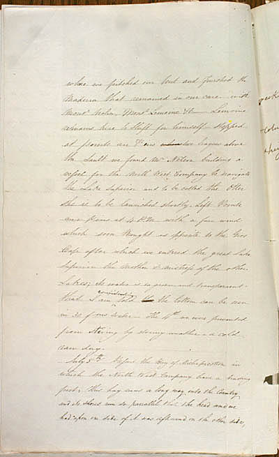 MacDonell, John. Description of Lake Athabasca and the Chipweans, ca. 1805 and Journal of a Voyage from Lachine to Fort River Qu'Appelle, 1793. An electronic transcription. MFTP #0005 where we pitched our tent and finished the Madeira that remained in our care with Monsr Nolin, Monsr Lemoine &c[.] Lemoine remains here to Shift for himself[.] [S]topped at Pointe au Pins where two leagues above the Sault we found Mr Nelson building a vessel for the North West Company to navigate the Lake Superior and to be called the Otter[.] [S]he is to be launched shortly. Left Pointe aux Pins at 4 P.M. with a fair wind which soon Brought us opposite to the Gros Cap after which we entered the great Lake Superior the mother and mistress of the other Lakes; its water is so green and transparent that I am told the bottom can be seen in 30 fms water[.] The 4th we were prevented from stiring by stormy weather – a cold raw day. July 5th[.] Passed the Bay of Michipicotton in which the North West Company have a trading post[.] This bay runs a long way into the Country and its shores run so parrallel that the head wind we had upon on side of it was aft-wind on the other side, [74] L E G E N D : |