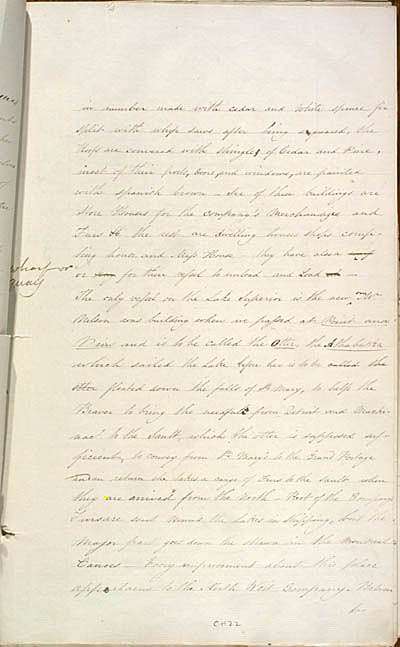 MacDonell, John. Description of Lake Athabasca and the Chipweans, ca. 1805 and Journal of a Voyage from Lachine to Fort River Qu'Appelle, 1793. An electronic transcription. MFTP #0005 in number made with cedar and white spruce fir split with whip saws after being suquared, the Roofs are couvered with shingles of Cedar and Pine, most of their posts[,] Doors[,] and windows[,] are painted with spanish brown[.] Six of these buildings are Store Houses for the company's Merchandizes and Furs &c., the rest are dwelling houses[,] shops[,] compting house and Mess House[.] [T]hey have also a warf or kay for their vessel to unload and Load at[.] The only vessel on the Lake Superior is the new Mr Nelson was building when we passed at Point aux Pins and is to be called the tter, the thabaska which sailed to Lake before her is to be floated down the falls of St Mary, to help the Beaver to bring the needfull from Detroit and Mackinac to the Sault, which the otter is supposed sufficient, to convey from St Mary's to the Grand Portage an in return she takes a cargo of Furs to the Sault when they are arrived from the North[.] Part of the Company's Furs are sent Round the Lakes in Shipping, but the major part goes down the ottawa in the Montreal Canoes[.] Every improvement about this place appartains to the North West Company. Between two [79] L E G E N D : |
