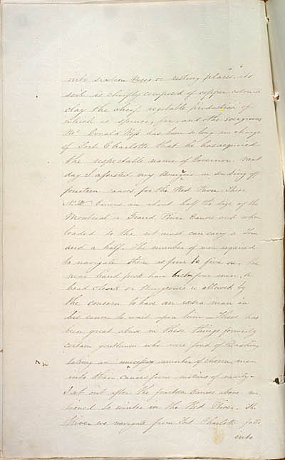 MacDonell, John. Description of Lake Athabasca and the Chipweans, ca. 1805 and Journal of a Voyage from Lachine to Fort River Qu'Appelle, 1793. An electronic transcription. MFTP #0005 into sixteen Poses or resting places, its soil is cheifly composed of copper coloured clay the cheif vegetable production of which is spruce, fir, and othe evergreens. Mr Donald Ross has been so long in charge of Fort Charlotte that he has acquired the respectable name of Governor. Next day I assisted my Bourgois in sending off fourteen canoes for the Red River[.] These N.W. Canoes are about half the Size of the Montreal or Grand River Canoes and when loaded to the utmost can carry a Tun and a half. The number of men required to navigate them is four to five i.e. the near hand posts have but four men. A head clerk or Bourgeouis is allowed by the concern to have an extra man in his canoe to wait upon him[.] There has been great abuse in these things formerly certain gentlemen who were fond of Dashing taking an unecessary number of chosen men into their canoes from motives of vanity. I set out after the fourteen Canoes above mentioned to winter in the Red River[.] The River we navigate from Fort Charlotte falls into [82] L E G E N D : |