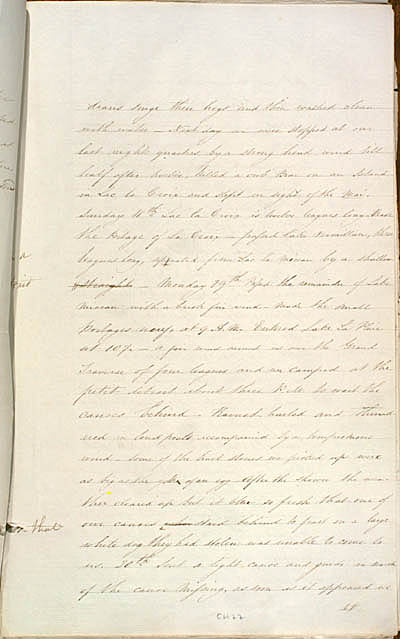 MacDonell, John. Description of Lake Athabasca and the Chipweans, ca. 1805 and Journal of a Voyage from Lachine to Fort River Qu'Appelle, 1793. An electronic transcription. MFTP #0005 [-]dians singe their hogs and then washed clean with water[.] Next day we were stopped at our last nights quarters by a strong head wind till half after twelve, killed a cub Bear on an Island in Lac la Croix and slept in sight of the Mai. Sunday 18th[.] Lac la Croix is twelve leagues long[.] Made the Portage of La Croix[.] [P]assed Lake Vermillion, three leagues long, seperated from Lac la Miccan by a shallow straight[.] Monday 19th[.] Passed the remainder of Lake Miccan with a brisk fair wind[.] [M]ade the small Portages neuf, at 9 A.M. Entered Lake La Pluie at 10 ½[.] A fair wind carried us over the Grand Traverse of four leagues and we camped at the petit detroit about three P.M. to wait the canoes behind[.] Rained, hailed and thundered in loud peals accompanied by a tempestuous wind[.] Some of the hail stones we picked up were as big as the yolke of an egg[.] After the shower the weather cleared up but it blew so fresh that one of our canoes who staid behind to feast on a large white dog they had stolen was unable to come to us. 20th[.] Sent a light canoe and guide in search of the canoe missing, as soon as it appeared we Set [87] L E G E N D : |