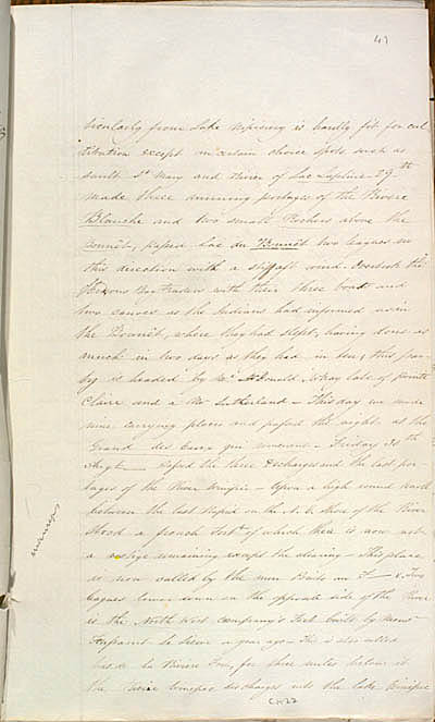 MacDonell, John. Description of Lake Athabasca and the Chipweans, ca. 1805 and Journal of a Voyage from Lachine to Fort River Qu'Appelle, 1793. An electronic transcription. MFTP #0005 [-]ticularly from Lake Nipising is hardly fit for cultivation except in certain choice spots such as Sault St Mary and Rivier of Lac Lapluie[.] 29th[.] [M]ade three running portages of the River Blanche and two small Rochers above the Bonnêt, passed Lac du Bonnêt two leagues in this direction with a stiff aft wind. Overtook the Husons Bay traders with their three boats and two canoes as the Indians had informed us in the Bonnêt, where they had slept, having done as much in two days as they had in ten; this party is headed by Mr Donald McKay late of Pointe Claire and a Mr Sutherland[.] This day we made nine carrying places and passed the night at the Grand des Eaux qui remeuent[.] Friday 30th Augt[.] Passed the three Decharges and the last portages of the River Winipie[.] Upon a high round knoll between the last Rapid on the N.E. shore of the River stood a french Fort of which there is now not a vestige remaining except the clearing[.] This place is now called by the men Pointe au F___e. Two leagues lower down on the opposite side of the River is the North West Company's Fort built by Monsr Toussaint Le Sieur a year ago[.] This is also called bas de la Riviere Fort, for three miles below it the Rivier Winipie discharges into the lake Winipie [91] L E G E N D : |