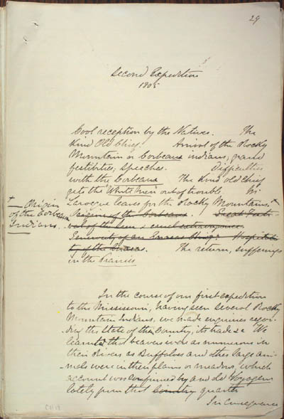 McKenzie, Charles. The Mississouri Indians, 1809. An electronic transcription. MFTP #0009 [In a different hand; on different paper] Second Expedition Cool reception of the Natives. The Kind Old Chief. Arrival of the Rocky Mountain or Corbeaux indians; grand festivities; Speeches. Difficulties with the Corbeaux[.] The Kind old Chief gets the "White Men" out of trouble. Mr Larocque leaves for the Rocky Mountains. The return, sufferings in the Prairies[.] In the course of our first Expedition to the Mississouri, having seen Several Rocky Mountain Indians, we made enquiries regarding the State of their Country, its trade &c[.] We learnt that beavers were as numerous in their Rivers as Buffaloes and other large animals were in their plains or meadows, which account was confirmed by an old Voyageur lately from that quarter[.] In consequence [29] L E G E N D : |