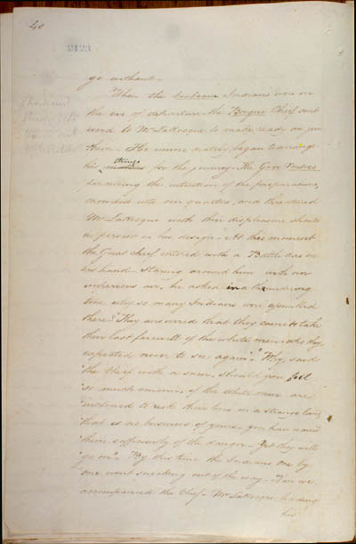 McKenzie, Charles. The Mississouri Indians, 1809. An electronic transcription. MFTP #0009 go without[.] When the Corbeau Indians were on the eve of departure – the Borgne Chief sent word to Mr LaRocque to make ready and join them[.] He immediately began to arrange his matters for the journey[.] The Gros Ventres perceiving the intention of the preparations crowded into our quarters, and threatened Mr LaRocque with their displeasure should he persist in his design[.] At this moment the Great chief entered with a Battle axe in his hand[.] Staring around him with an imperious air, he asked us a thoundering tone why so many Indians were assembled there? "They answered that they came to take their last farewell of the white men – who they expected never to see again." "Why, said the Chief with a sneer, should you feel so much concern, if the white men are inclined to risk their lives in a strange land, that is no business of yours – you have warned them sufficiently of the danger – yet they will go on[.]" By this time the Indians one by one went sneaking out of the way[.] Then we accompanied the Chief – Mr LaRocque leading his [40] L E G E N D : |