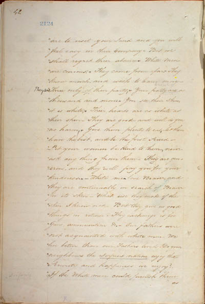McKenzie, Charles. The Mississouri Indians, 1809. An electronic transcription. MFTP #0009 are to visit your Land and you will feel easy in their Company[.] But we shall regret their absence[.] White men are curious[.] They came from afar. They know much, and wish to learn more[.] Three only of their party[.] Your party are a thousand and more[.] You see their skin, it is white[.] Their hearts are as white as their skin[.] They are good and will do you no harm[.] Give them plenty to eat – let them have the best, and be the first Served[.] Let your women be kind to them – never ask any thing from them[.] They are generous, and they will pay you for your kindness[.] White me love Beaver, and they are continually in search of Beaver for its skin[.] What use they make of the skin I know not[.] But they give us good things in return[.] They exchange it for Guns, ammunition &c[.] Our fathers were not acquainted with white men[.] We live better than our Fathers lived[.] Do your neighbours the Serpent nation enjoy the Security and happiness we enjoy? If the White men could furnish them as [42] L E G E N D : |