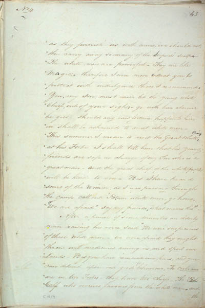 McKenzie, Charles. The Mississouri Indians, 1809. An electronic transcription. MFTP #0009 No 4 as they furnish us with arms we should not, then carry away so many of the serpents scalps[.] The white men are powerful[.] They are like Magic – therefore I once more intreat you to protect with indulgence those I recommend[.] You my Son; must never let the young white Chief, out of your sight – go with him wherever he goes – should any misfortune happen to him we shall be ashamed to meet white men[.] This summer I mean to visit the Great White at his Fort[.] I shall tell him that his young friends are safe in charge of my Son who is a great man – and the great chief of the whites people will be kind to you[.] But I have heard some of the Women, as I was passing through the camp call out "Return white men, go home, We are afraid" say my friends what means this[.]" After a pause of some minutes an elderly man raising his voice said "We were suspicious of these white men – we were afraid they might throw evil medicines among us, and spoil our Lands. But you have removed our fears, and you can depend upon our good behaviour[.] The corbeaux are in two Tribes – they have two Chiefs – The Red Calf who receives favours from the white men – and the [43] L E G E N D : |