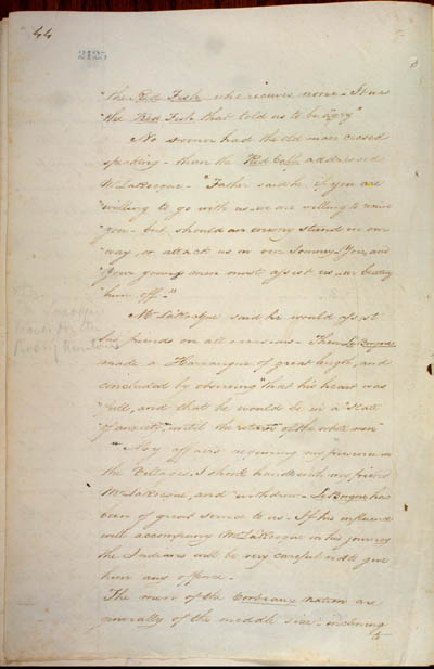McKenzie, Charles. The Mississouri Indians, 1809. An electronic transcription. MFTP #0009 the Red Fish who receives none[.] It was the Red Fish that told us to be agry[.]" No sooner had the old man ceased speaking – than the Red Calf addressed Mr LaRocque[.] "Father said he, if you are willing to go with us – we are willing to receive you – but should an enemy stand in our way, or attack us in our Journey – You, and Your youn men must assist us – in beating him off[.]" Mr LaRocque said he would assist his friends on all occasions. Then Le Borgne made a Harrangue of great length, and concluded by observing "that his heart was full, and that he would be in a State of anxiety, until the return of the white men[.]" My affairs requiring my presence in the Villages, I shook hand with my friend Mr LaRocque, and withdrew[.] Le Borgne has been of great service to us[.] If his influence will accompany Mr LaRocque in his journey the Indians will be very careful not to give him any offence[.] The men of the Corbeaux nation are generally of the middle size – inclining to [44] L E G E N D : |