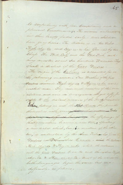 McKenzie, Charles. The Mississouri Indians, 1809. An electronic transcription. MFTP #0009 to corpulency with fair Complexion and a pleasant Countenance[.] The women are handsome but their beauty fades early – even children have gray hairs[.] The Nation is in two tribes Kegh-chy-sa and Hey-re-ro-ka – Governed by two Chiefs The Red Calf and the Red Fish and may muster about six hundred Warriors[.] They speak a dialect of the Gros Ventres[.] The origin of the corbeaux is accounted for in the following manner. Two Brothers of the Gros Ventres named Regh-chy-sa & Hey-re-ro-ka were wicked men[.] They murdered numbers of their own relations, and were in consequence obliged to fly for safety to the distant recesses of the Rocky Mountains[.] Then falling in with the Flat Heads they provided themselves with wives from that nation – who speaking a different language the offsprings of that connection became a new tribe – speaking a new dialect, which being a mixture of the other two is understood by the three Tribes[.] Les Gros Ventres call themselves E-na-sa – the Corbeauxs Kegh-chy-sa & Hey-re-ro-ka while the corbeaux's call the Gros Ventres E-na-ta and themselves Keigh-chy-ta & Hen-ne-no-ta[.] Most of the words in both Languages begin the same but end differently – as follows – [45] L E G E N D : |