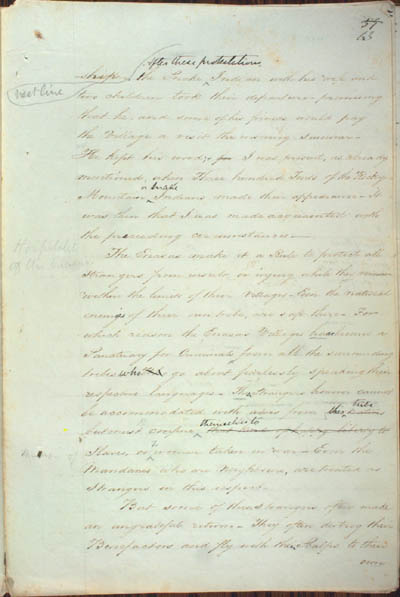 McKenzie, Charles. The Mississouri Indians, 1809. An electronic transcription. MFTP #0009 s the Snake Indian with his wife and two children took their departure – promising that he and some of his friends would pay the Village a visit the ensuing Summer[.] He kept his word – for I was present, as already mentioned when Three hundred Tents of the Rocky Mountain Indians made their appearance[.] It was then that I was made acquainted with the prceeding circumstances[.] The Enanas make it a Rule to protect all Strangers from insult or injury while they remain within the limits of their Villages[.] Even the natural enemy of their own tribe, are safe there[.] For which reason the Enasas Villages has become a Sanctuary for Criminals from all the surrounding tribes – Who go about fearlessly speaking their respective languages[.] The Strangers however cannot be accommodated with wives from the natives but must confine that kind of happy liberty to Slaves, or women taken in war[.] Even the Mandanes who are neighbours are treated as Strangers in this respect[.] But some of these Strangers often make an ungrateful return[.] They often destroy their Benefactors and fly with the Scalps to their own [65] L E G E N D : |