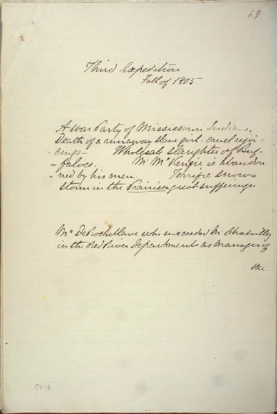 McKenzie, Charles. The Mississouri Indians, 1809. An electronic transcription. MFTP #0009 [In a different hand; on different paper] Third Expedition A war Party of Mississouri Indians, Death of a runaway Slave girl, cruel rejoicings[.] Wholesale slaughter of Buffaloes. Mr McKenzie is abandoned by his men. Terrific snowstorm in the Prairies & great sufferings. Mr De Rocheblave who succeeded Mr Chaboillez in the Red River Department as manager of the [71] L E G E N D : |