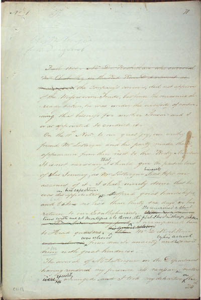 McKenzie, Charles. The Mississouri Indians, 1809. An electronic transcription. MFTP #0009 No1 Fall 1805[.] Mr De Rocheblave who succeded Mr Chaboillez in the Red River Department as manager of the Company's concerns did not approve of the Mississourie Trade, but from the measures already taken he was under the necessity of continuing that busness for another Season – and I was appointed to conduct it[.] On the 18th Novr to our great joy our worthy friend Mr LaRocque and his party made their appearance from their visit to the Rocky Mountain[.] It is not necessary I should give the particulars of this Journey as Mr LaRocque has kept an account of it[.] I shall merely observe that he was dis-appointed – Suffered great hardships and taken no less than thirty six days on his return to our Establishment[.] After remaining a Short time at my post – I accompanied him to Head quarters – When Mr De Rocheblave was releived from much anxiety and received him with great kindness[.] The arrival of Mr LaRocque in the Department having rendered my presence less necessary – matters where arranged – and I took my departure the 24th [73] L E G E N D : |