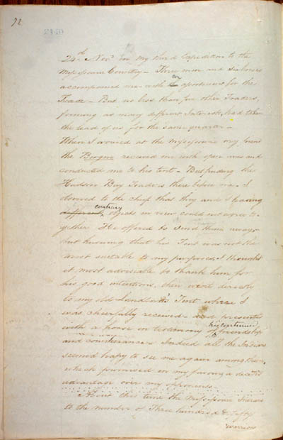 McKenzie, Charles. The Mississouri Indians, 1809. An electronic transcription. MFTP #0009 24th Novr on my third Expedition to the Mississourie Country[.] Three men and six horses accompanied me – with the assortment for the Trade[.] But no less than five other Traders, forming as many different Interests had taken the lead of us for the same quarter[.] When I arrived at the Mississourie my friend the Borgne received me with open arms and conducted me to his tent[.] But finding the Hudson Bay Traders there before me – I observed to the chief that they and I ha different objects in view could not agree together[.] He offered to Send them away – but knowing that his Tent was not the most suitable to my purposes, I th it most adviseable to thank him for his good intentions, then wnt directly to my old Landlord's Tent whe I was cheerfully received – and presented with a horse in testimony of friendship and countenance[.] Indeed all the Indians seemed hapy to see me again among them which promised in my favour a decided advantage over my opponents[.] About this time the Mississouri Indians to the number of Three hundred & fifty warriors [74] L E G E N D : |