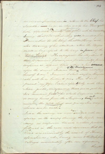 McKenzie, Charles. The Mississouri Indians, 1809. An electronic transcription. MFTP #0009 No 5 an occasion handed over in return to the Chief, his Saddle – bags, in other words his Purse and both appeared equally delighted with the transaction[.] [S]eeing that Mr Chaboillez was provided for I remarked to the Chief that Mr Henry was also deserving of his attention – And the Borgne made a long speech to the Camp in favour of the White Chiefs[.] He expressed his obligations to them for personal favours and for numberless favours conferred at different times within a few seasons upon the Several Indians tribes[.] Then addressing himself to me "Tomorrow I shall adopt a Shayann who will be a brother to you[.] Then I will present my Pipe loaded plentifully with Christian goods and among those goods will be two hundred Guns – for which I expect in return so many horses from the Shayanns – Out of which number the white chief and you my Son may choose one for each[.]" Late in the evening we were annoyed with an uproar in the camp[.] Observing the people running in confusion towards a certain point we followed in the rear and discovered that the noise was occasioned by the arrival of Three Asseneboines – who having come to the Mississourie Villages immediately after our departure thought [105] L E G E N D : |