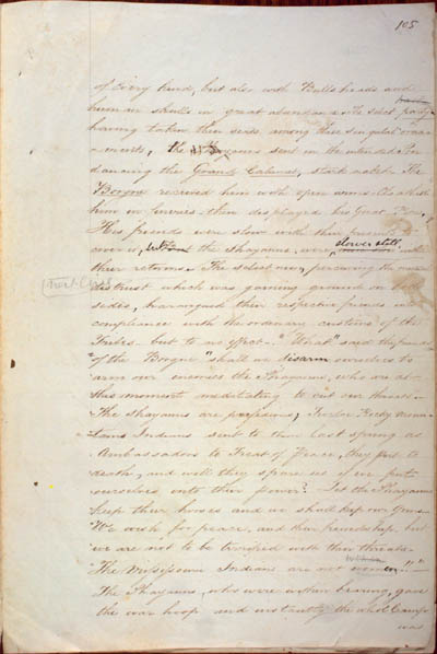 McKenzie, Charles. The Mississouri Indians, 1809. An electronic transcription. MFTP #0009 of Every kind but also with Bulls heads and human skulls in great abundance[.] The select party having taken their seats among these singulal ornaments – the Shayanns sent in the intended Son dancing the Grand Calumet stark naked[.] The Borgne received him with open arms – Cloathed him in fineries – then displayed his Great Pipe[.] His friends were slow with their presents to cover it. But the Shayanns were more slow with their returns[.] The select men perceiving the mutual distrust which was gaining ground on both sides harangued their respective friends into compliance with the ordinary customs of the Tribes – but to no effect[.] "What said the friends of the Borgne shall we disarm ourselves to arm our enemies the Shayanns who are at this moment meditating to cut our throats[.] The Shayanns are perfidious[.] Twelve Rocky Mountains Indians sent to them last spring as Ambassadors to Treat of Peace they put to death – and will they spare us if we put ourselves into their Power? Let the Shayanns keep their horses and we shall keep our Guns[.] We wish for peace, and their friendship, but we are not to be terrified with their threats[.] The Mississourie Indians are not women!!" The Shayanns, who were within hearing gave the war hoop and instantly the whol Camp was [107] L E G E N D : |