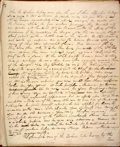 McKenzie, Charles. Journal of the Second, Third and Fourth Expeditions to the Missouri, 1805, 1806 with the Supplement to the Second Expedition. An electronic transcription. MFTP #0010 No 4 When the Corbeau tribe were upon the eve of their departure Le Borgne sent word to Mr La Rocque to make ready and join them[.] Mr La Rocque immediately set about arranging his matters for the Journey which the Gros ventres perceiving they crowded into our quarters and threatened Mr La Rocque with the effect of their displeasure if he persisted in his design[.] At this moment the great Chief entered with a battle axe in his hand[.] He stared around and with an imperious air asked the Indians present why so many of them were assembled there[.] They answered that they were there only to take their last farewell of the White men whom they never expected to see again. "Why," said the Chief with a sneer,– ["]If the White people have a mind to die that is nothing to us[.] You have often enough warned them of the danger. Yet they will go on." The Indians sneaked out of the way – and we accompanied the Chief Mr La Rocque leading his horse by the bridle[.] When we entered the Camp many of the tribe signified their disapprobation of Mr La Rocques intention and we could hear them exclaim "Where are You going White people. Return – go home . We do not wish for Your Company. Many of our Young men are without sense; We are afraid." Their unfavorable appearances had no effect upon Mr La Rocque[s] resolution[.] But one of the men who was to have been of the party thought he found himself indisposed and applied for leave to remain with me[.] "I see plainly your sickness" 'said Mr La R' you are an old woman – You may therefore remain[.]" This unexpected discovery of the fellows weakness threw him into a violent passion and he was very abusive[.] However Mr La R. took no notice this conduct – for he could not punish so much insolence before so many strange Indians without injury our engagements[.] The principal men of the Corbeau tribe having by this time [7] L E G E N D : |