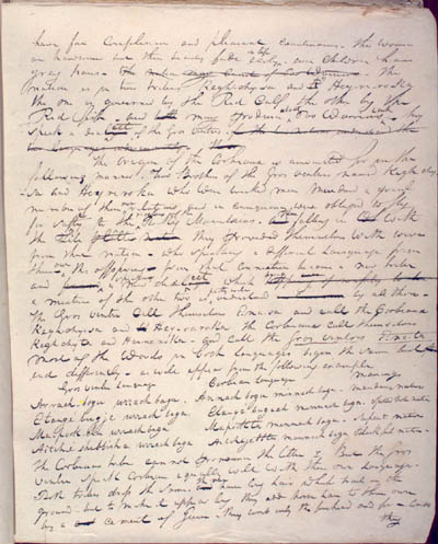 McKenzie, Charles. Journal of the Second, Third and Fourth Expeditions to the Missouri, 1805, 1806 with the Supplement to the Second Expedition. An electronic transcription. MFTP #0010 have fair complexion and pleasant countenances[.] The women are handsome but their beauty fade early – even children have gray hairs[.] The nation is in two tribes Kegh-chy-sa and Hey-re-ro-ka the one is governed by the Red Calf the other by the Red fish – and may produce 600 warriors [.] They speak a dial of the Gros Ventres. The origin of the Corbeaux is accounted for in the following manner. Two Brothers of the Gros Ventres named Kegh chy-sa and Hey re ro ka who were wicked men murdered a great number of their relations and in consequence were obliged to fly for safty to the Rocky Mountains. falling in with the Tête plâlte they provided themselves with wives from their nation – who speaking a different Language from their the offspring[.] [F]rom that connection became a new tribe and a new dial which bring a mixture of the other two is understood by all them[.] The Gros Ventres call themselves E-na-sa and call the Corbeaux Kegh-chy-sa and Hey-ru-ru-ka[.] The Corbeaux call themselves Kegh chy ta and Henne no Ka – and call the Gros Ventres E-na-ta[.] Most of the Words in both Languages begin the same but end differently – as will appear from the following example