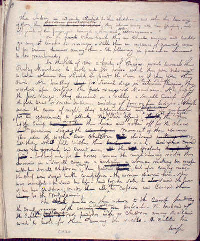 McKenzie, Charles. Journal of the Second, Third and Fourth Expeditions to the Missouri, 1805, 1806 with the Supplement to the Second Expedition. An electronic transcription. MFTP #0010 No 3 These Indians are extremely attached to their children – and when they lose any of them they ; they throw away all their property, cut off joints of their fingers, and commit a thousand extravagances[.] [O]n the other hand they are cruel enemies and will go any lengths for revenge[.] Still there are instances of generosity even to an enemy discovered among them[.] The following in particular deserves to be mentioned. In the fall of 1804 a party of Enasas went towards the Rocky Mountains to look out for horses which they were determined to take wherever they should be found the same as if they were their own. After travelling for several days in extensive plains they resolved upon crossing the Mountains. After passing the first range – they discovered in a valley a small Camp of the flat Head or snake Indians consisting of four or five lodges – under the cover of night they approached and in ambush for an opportunity to attack. The soon offered. the men of the Camp their horses and rode off for the chace[.] warriors seiz the moment of their absence flew upon the women and children destroyed all those who fell within their reach – and carried away their property [.] Looking out for horses among the neighbouring rocks they discovered in a small cave at a distance a woman making her escape with two small children – they pursued but upon coming near – the chief was seized with compassion – the woman charmed him – she was beautiful – he saved her life – and for her sake he saved the lives of her two children –; made all his captives and carried them to the Mississouri[.] The hunters on their return to the Camp finding the cruel ravages of the enemy were distracted[.] The husband of the captive not finding his wife or children among the slain went to look for them among the rocks[.] He called his wife [19] L E G E N D : |