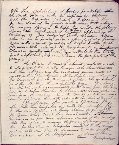 McKenzie, Charles. Journal of the Second, Third and Fourth Expeditions to the Missouri, 1805, 1806 with the Supplement to the Second Expedition. An electronic transcription. MFTP #0010 After these protestations of lasting friendship the Snake Indian with his wife and two children took their departure contentedly[.] He promised that he and some of his friends would return to the village the ensuing Spring[.] He Kept his word – the following spring and several of his appeared in the Company of 300 Lodges of Rocky Mountain Indians when he and his friends made a present of six farmer horses with a great quantity of dressed leather to the Enasas – who returned the Compliment in Christian goods I was Eye witness to this last part – by which I came to learn the first part of the story[.] The Enasas it must be observed make it a rule to afford protection to all strangers who throw themselves into their village – even their own natural enemies must not insult within these limits[.] It has therefore become a Sanctuary for Criminals from all the surrounding tribes – who go about in safety speaking their respective languages[.] These strangers cannot however be accommodated with wives from this tribe but must confine themselves to slaves – women taken in war from the enemy[.] Even the Mandanes who are next door neighbours dare not enter into this Kind of connection[.] These strangers often make a bad return[.] They often Kill their benefactors and with their scalps fly to their own nation and thereby obtain forgiveness for the crime which caused their banishment[.] [T]he Enasas are from dire experience sensible of this treachery still they continue to encourage the presence of strangers among them – for they serve as Interpreters to the many nations who send in the summer to trade for their commodities of the Mississouri[.] Some of these Interpreters [22] L E G E N D : |