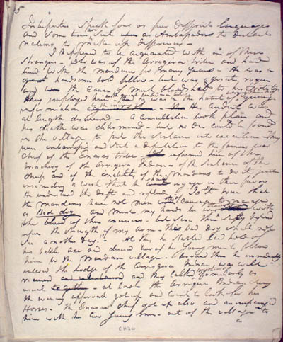 McKenzie, Charles. Journal of the Second, Third and Fourth Expeditions to the Missouri, 1805, 1806 with the Supplement to the Second Expedition. An electronic transcription. MFTP #0010 No 5 Interpreters speak four or five different languages and some times sent as Ambassadors to distant nations to make up differences[.] I happened to be acquainted with one of these Strangers – who was of the Arrigira tribe and had lived with the Mandans for many years[.] He was a handsome bold fellow – but was a great rogue and the cause of much bloodshed to his protectors[.] [T]hey employed him – he was in the habit of giving information [.] His conduct was at length discovered[.] A consultation took place and his death was determined – but no one could be found in the village to put the sentence into execution[.] They were embarrassed and sent a deputation to the famous war chief of the Enasas tribe – informed him of the treachery of the Arrigira Indian – of the sentence of the chief and of the inability of the Mandans to do it justice insinuating a wish that he engage in their favor[.] He understood the drift and replied – "Is it true that the Mandanes have not men courage to manage a Bad dog and must my hands be ever with the blood of their enemies – but since their safety depend upon the strength of my arm – this bad Dog shall not see another day." At this he started laid hold of his battle axe and desired two of his Young men to follow him to the Mandane village[.] Arrived there he immediately entered the Lodge of the Arrigira Indian was well received and they talked familiarly as usual – at last the Arrigira Indian seeing the evening approach got up and went to look for his Horses – the Enasas chief got up also and accompanyed him with his two Young men – out of the village to a [23] L E G E N D : |