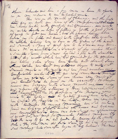 McKenzie, Charles. Journal of the Second, Third and Fourth Expeditions to the Missouri, 1805, 1806 with the Supplement to the Second Expedition. An electronic transcription. MFTP #0010 No 4 them behind and hire a free man in lieu to assist us on our return to our Establishment. This was in the month of February – and the first day we took our leave of the Mississouri with ten horses loaded with property and provisions[.] We went on until dark in hopes of falling in with a good spot of grass to feed our horses – but the plains having been burnt in the fall and covered with Buffaloes all winter the whole country was as bare as the palm of the hand and scarcely a sprig of grass was to be seen in any direction. We encamped in a swamp of dry rushes cleared a small space from snow lighted a fire with small bits of dry wood which we had provided for the purpose and having eaten some corn Cakes and drank some snow water we laid our selves down to rest. It snowed much in the night and we found ourselves very comfortable under it the air was raw. Next morning, when we got up seven of our horses were missing and could not be found in the vicinity[.] We therefore covered our baggage with snow, mounted our horses and returned to the villages[.] Here we learned that horses were in the possession of an Indian[.] [W]e went to Lodge he readily gave them up and we passed the night in his lodge, where we were treated with Kindness. The ensuing morning we sat out – found our baggage safe – loaded our horses and continued our course till night came on – but seeing no appearance of wood for nor grass for provender I desired Morison who led the way to go on and guide his course by the North Pole[.] The other man did not seem at his ease however he said nothing but soon after began to lag behind[.] The snow in [31] L E G E N D : |