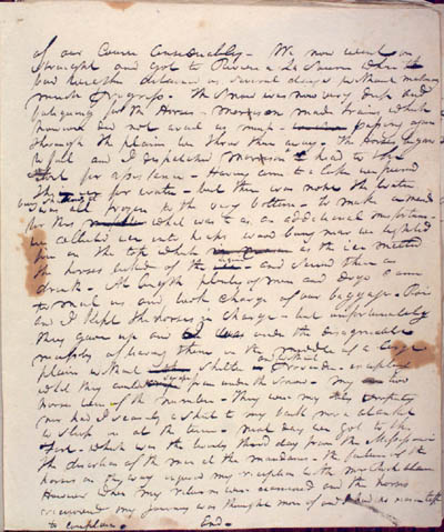McKenzie, Charles. Journal of the Second, Third and Fourth Expeditions to the Missouri, 1805, 1806 with the Supplement to the Second Expedition. An electronic transcription. MFTP #0010 of our course considerably[.] We now went on straight and got to Riviere a La Souris where bad weather detained us several days without making much progress. The snow was now very deep and fatiguing for the Horses[.] Morison made trains which however did not avail us much – passing again through the plains we threw them away[.] The Horses began to fail and I dispatched Morison head to the Fort for assistance[.] Having come to a lake we pierced the ice for water – but there was none the water was all frozen to the very bottom[.] To make amends for this what was to us an additional misfortune – we collected ice into heaps wood being near we lighted fire on the top which as the ice melted the horses licked of the – and served them as drink[.] At length plenty of men and dogs came to meet us and took charge of our baggage[.] Roi and I Kept the horses in charge – but unfortunately they gave up and under the disagreeable necessity of leaving them in the middle of a large plain without Shelter provender – excepting what they could from under the snow – my two horses were of the number[.] They were my only property nor had I scarcely a shirt to my back nor a blanket to sleep in at the time[.] Next day we got to the Fort – which was the twenty third day from the Mississouri[.] The desertion of the men at the Mandanes – the failure of the horses on the way injured my reception with Mr Rocheblave[.] However when my returns were examined and the horses recovered my journey was thought more of and I had no reason left to complain. End. [34] L E G E N D : |