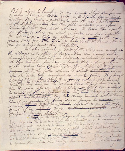 McKenzie, Charles. Journal of the Second, Third and Fourth Expeditions to the Missouri, 1805, 1806 with the Supplement to the Second Expedition. An electronic transcription. MFTP #0010 But to return to business. On my arrival I found some free men to whom I had given goods on credit the preceeding winter. They made a good hunt upon the upper parts of the Mississouri – paid their debts and traded many furs which they had over and above. The Indians were equally successful; so that my stock in trade was soon expended to advantage[.] But an appointment with a man sent from The Fort to deal with the Panees detained me for a longer period than I expected[.] In this interval a band of the Shayans arrived at the villages with offers of Peace[.] They were received with demonstrations of friendship; and handsomely entertained for many days. At their departure they were informed that a Young man of their nation taken prisoner some Years before would be given up to his father whenever he should [.] Soon after the father came accompanied by Several young . They brought a message from their Chief to a warrior of the Enasas tribe inviting him in the warmest terms to pay him a visit[.] This Young man who was also a great chief was willing to accept of the invitation but his afraid of treachery & opposed his [.] They had many councils which however were of no avail – the Young warrior fearing his renoun suffer was resolved to give fresh proof of his courage – and he prepared for his departure[.] I in the Borgnes Lodge[.] It was there all strangers came first – and all the wise men of the nation assembled on great occasions[.] I therefore a good opportunity to learn whatever was going on[.] Strangers who were not in the habit of meeting White people looked at me with curiosity[.] Some were afraid to come near me – others were troublesome and wished to Know if I was in all the same as Indians[.] I used to question them about their country – their manner of living & of trading [.] I [36] L E G E N D : |