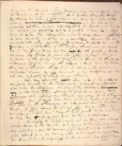 McKenzie, Charles. Journal of the Second, Third and Fourth Expeditions to the Missouri, 1805, 1806 with the Supplement to the Second Expedition. An electronic transcription. MFTP #0010 thing we do at such a long distance from our village as he resides[.] Is he a Spirit? Is he taller than the Hills? He must be like a Mountain and have eyes like the sun – – he has plenty of scarlet cloth – he gives scarlet cloth for Beaver – he must be dressed in scarlet cloth himself[.]" I was at a loss how to take this observation[.] I could not discern whether it was meant in Joke or in earnest[.] However the chief immediately after gave me a Young man to assist me in the journey[.] I took three of the Companys horses – one for myself one for my Young man and one for the goods. Next morning at dawn I joined the Rattle Snake (for that was the name of the Young war chief) and his party at the next village[.] Passing through the village I could hear the Indians say among themselves that I had no sense – the women in particular seemed greatly concerned in my welfare; and they told me repeatedly I should never return[.] When we assembled were out of the village our party consisted of the Rattle Snake twelve young Scamps of his tribe ten Shayanns and some of the Mandanes; in all about forty[.] Among the Mandanes was a Mr Jissaume who informed me that he was going to the Shayannes En pipe and that he was sure of being well received[.] For said he the Shayannes do not Know how to trade: therefore if You wish for success, You must follow my example. I told him no;– that I would trade regularly, or keep my property, and leave nothing to chance. At night the Rattle Snake and his Young men were rather down in the mouth – and began to question me about my intentions – and the manner I was disposed to act in case of an attack from an enemy[.] They asked me for ammunition[.] This demand I would not satisfy for the moment – but assured them that [38] L E G E N D : |