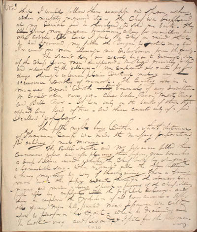 McKenzie, Charles. Journal of the Second, Third and Fourth Expeditions to the Missouri, 1805, 1806 with the Supplement to the Second Expedition. An electronic transcription. MFTP #0010 No 3 that I would follow their example and spare nothing when necessity required it[.] The Chief was displeased at my denial and he threatened to send me back[.] The Young men became troublesome asking for vermilion and other articles[.] At last I put the Chief in mind that he had promised my father the Borgne to protect me;– and I received no more illusage nor disturbance from the party[.] The second day our escort began to diminish – six of the Chiefs Young men disappeared – they lagged gradually behind and returned to the villages[.] We continued our route for four days through extensive plains without meeting any occurence worthy of remark. The country was in a manner covered with animals of every description[.] We crossed three rivers viz – Clear Water River, Heart River and Ball River[.] It was only on the banks of these that appeared any Kind of trees – and these consisted only of a few scattered poplars. The fifth night being within a short distance of Shayanne Camp we made the necessary preparations for entering it next morning. The Rattle Snake and Mr Jissaume filled their ceremonious pipes and after placing them upon green branches a deep silence ensued which the Chief broke by singing a lamentable song[.] When he finished all the others uttered a heavy murmur by way of thanks giving[.] Then a Young man took the pipe ent through the ordinary ceremonies and made a long speech in favour of the Chief – setting forth all his exploits the brightest colours – and then he implored the protection of all living animals[.] After the Young man had finished Mons. Jissaume was called upon to perform his part – which he declined; he looked very awkward,– & I felt for the poor man[.] Seeing [39] L E G E N D : |