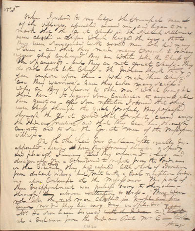 McKenzie, Charles. Journal of the Second, Third and Fourth Expeditions to the Missouri, 1805, 1806 with the Supplement to the Second Expedition. An electronic transcription. MFTP #0010 No 5 When I returned to my lodge the principal men of the village assembled around me and began to remark that the great chiefs in the Spanish Settlements were clothed in dresses which dazzled the eyes – that they were surrounded with armed men who had many Slaves – and that they made many presents to Indians[.] "Your chiefs continued they are white like the Chiefs of the Spaniards – but they are not great Chiefs[.] They do not look like Chiefs[.] The Indians think that you impose upon them[.] Who made them Chiefs? are they warriors? have they taken many scalps? Why are they superior to other men? What brought them here?" It required some consideration to answer all their questions[.] After some reflection I observed that they were chiefs through the great property they possessed through the great good that property caused among the Indian nations; and that they came here through curiosity and to see the Great men of the Mississouri villages[.] On the other hand our gentlemen felt equally disappointed[.] Leaving home they promised themselves a speedy and pleasant Journey – they experienced a long and disagreeable one[.] Accustomed to respect from the Indians in the vicinity they had expected little short of adoration from distant tribes – but met with a cool reception bordering upon contempt at the Mississouri[.] This part of their disappointment was perhaps owing to themselves – through extreme inattention to dress[.] "They were not like the rich man clothed in purple and fine linen nor did they live every day in splendor[.]" Mr H— soon became disgusted and at a distance from the Indians But Mr C— took things [43] L E G E N D : |